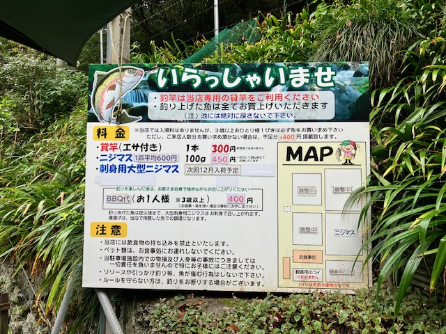 | 料金 | 釣り竿:300円 BBQ台:1人400円(3歳以上) ニジマス:450円/100g |