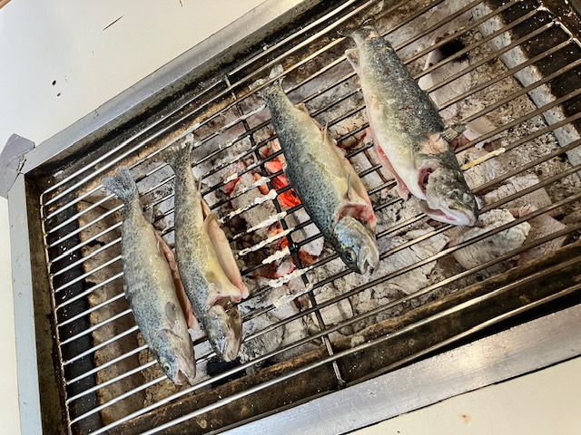 釣りたて&炭火で焼きたてのニジマスは格別。